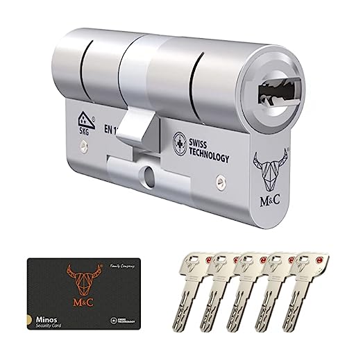 Publicidad M&C Minos Bombín Cerradura Alta Seguridad Anti Topolino Leva Larga Doble Embrague Máxima Seguridad SKG 3 Estrellas 32x32mm Anti Bumping Resistente Taladro Tecnología Suiza Pleateado 5 Llaves Incluidas