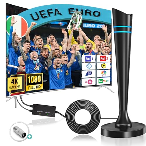 2024 Antenna TV Digitale, Antenna TV Interna Amplificata potente con portata di oltre 600+ km, Antenna Portatile TV da Interno Supporta 4K/1080P Smart HDTV, Con Cavo Coassiale 5m – Blu