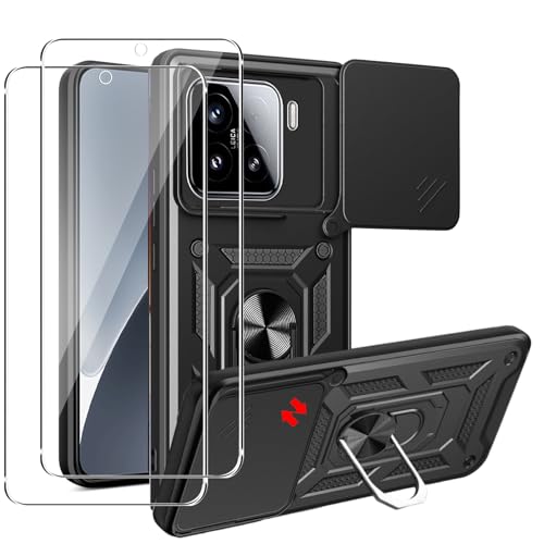 Publicidad MEMELOKA Funda para Xiaomi 15 + 2 Piezas Cristal Templado, Armor Carcasa Militar Antiarañazos con 360° Soporte de Anillo, Antigolpes Carcasa con Cubierta de Cámara Deslizante, Negro