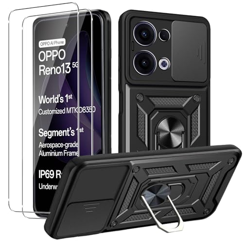 Publicidad MEMELOKA Funda para OPPO Reno 13 5G/Reno13 5G + Cristal Templado, Armor Carcasa Militar Antiarañazos con 360° Soporte de Anillo, Antigolpes Carcasa con Cubierta de Cámara Deslizante, Negro